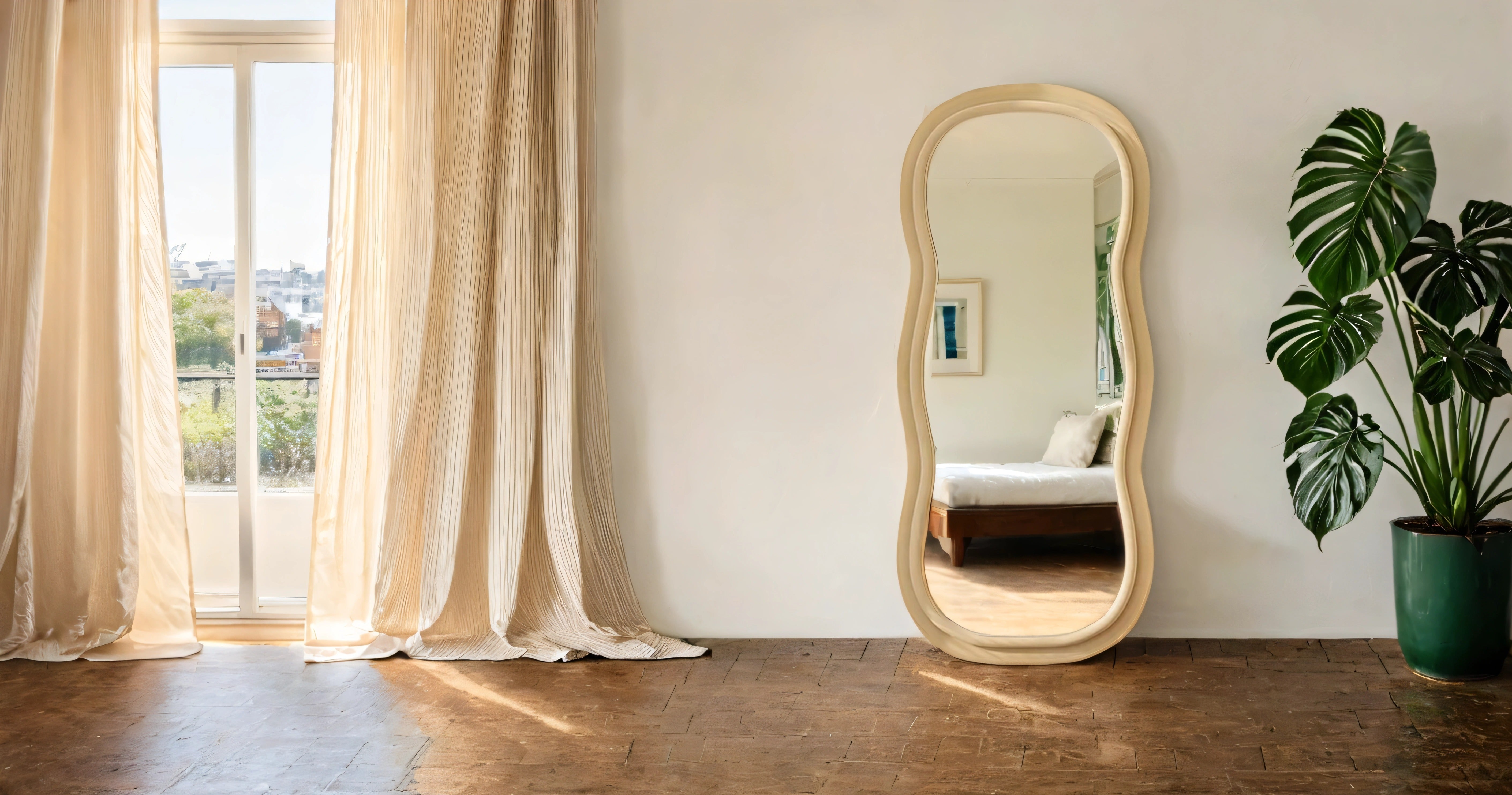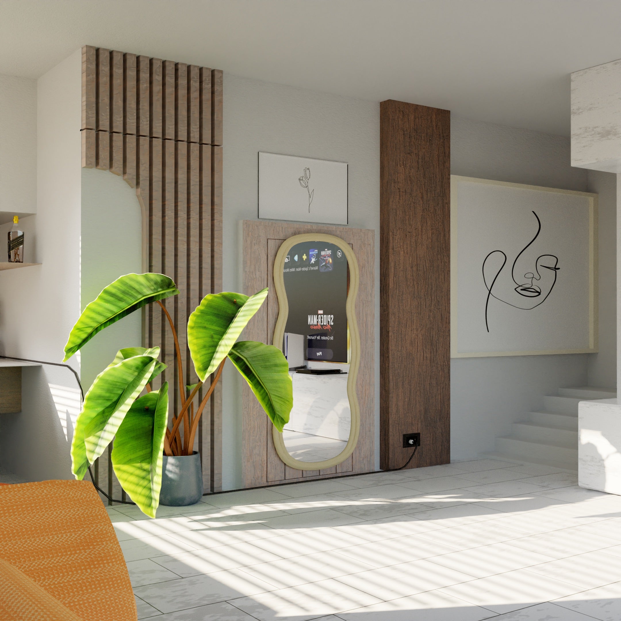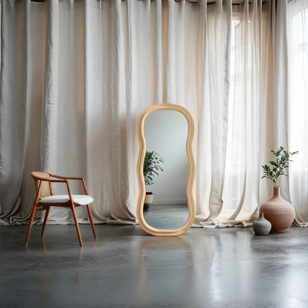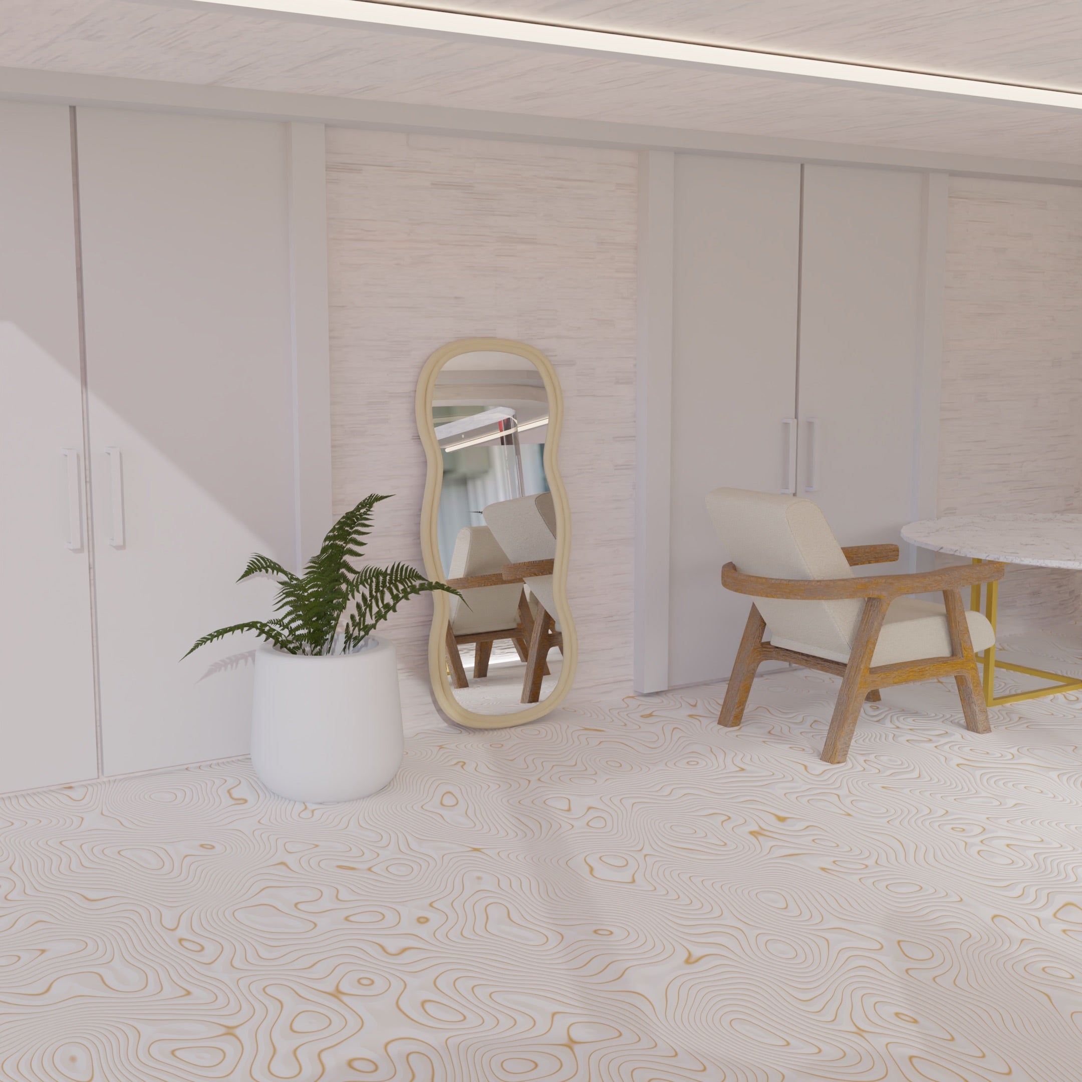Oplev forvandlingen, hvor en vision bliver til et færdigt produkt. Swipe og se, hvordan Bølgespejlet bringer stil og karakter ind i hjemmet. Som det ses på vores design studio illustration, er spejlet væghængt. Dette er også en mulighed, efter produktet blev til virkelighed, men hos CV har vi en forkærlighed for gulvspejle, der giver en tiltalende dybde i rummet 😌